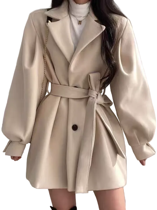 Women’s Short Puff Sleeve Belted Coat with Lapel Collar